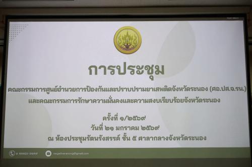 วันพุธที่ 21 มกราคม 2569 เวลา 13.30 น. ณ ห้องประชุมรัตนรังสรรค์ ชั้น 5 ศาลากลางจังหวัดระนอง นายราชัน มีน้อย ผู้ว่าราชการจังหวัดระนอง มอบหมายให้ นายวิธรัช รามัญ รองผู้ว่าราชการจังหวัดระนอง เป็นประธานการประชุมคณะกรรมการศูนย์อำนวยการป้องกันและปราบปรามยาเสพติดจังหวัดระนอง ครั้งที่ 1/2569 และต่อเนื่องในเวลา 14.30 น. ได้เป็นประธานการประชุมคณะกรรมการรักษาความมั่นคงและความสงบเรียบร้อยจังหวัดระนอง ครั้งที่ 1/2569 ซึ่งจัดประชุม ณ ห้องประชุมเดียวกัน โดยมีหัวหน้าส่วนราชการ ข้าราชการ ทหาร ตำรวจ และเจ้าหน้าที่ผู้เกี่ยวข้องชุดเดียวกัน เข้าร่วมประชุมอย่างพร้อมเพรียง